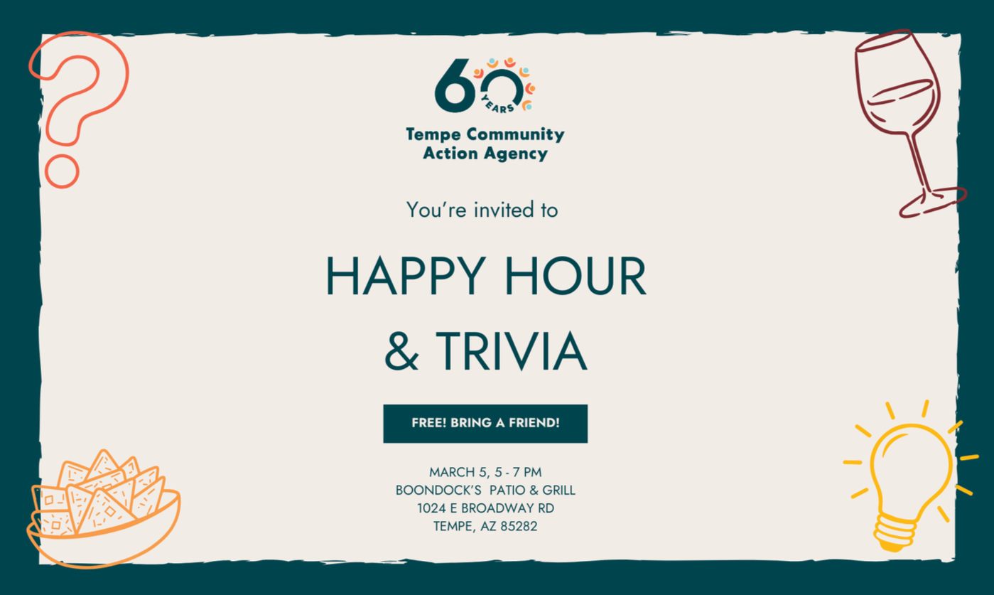 Join us for a FREE relaxed social time on the Boondocks patio on March 5th. This casual gathering is an opportunity to connect with TCAA staff in an easygoing setting. There’s no formal program—just a laid-back evening designed to spark conversation, build connections, and play some trivia. Complimentary appetizers will be provided. Drinks will be available for purchase March 5th 5pm - 7pm Boondocks Patio & Grill 1024 E Broadway Rd. Tempe, AZ 85282 |