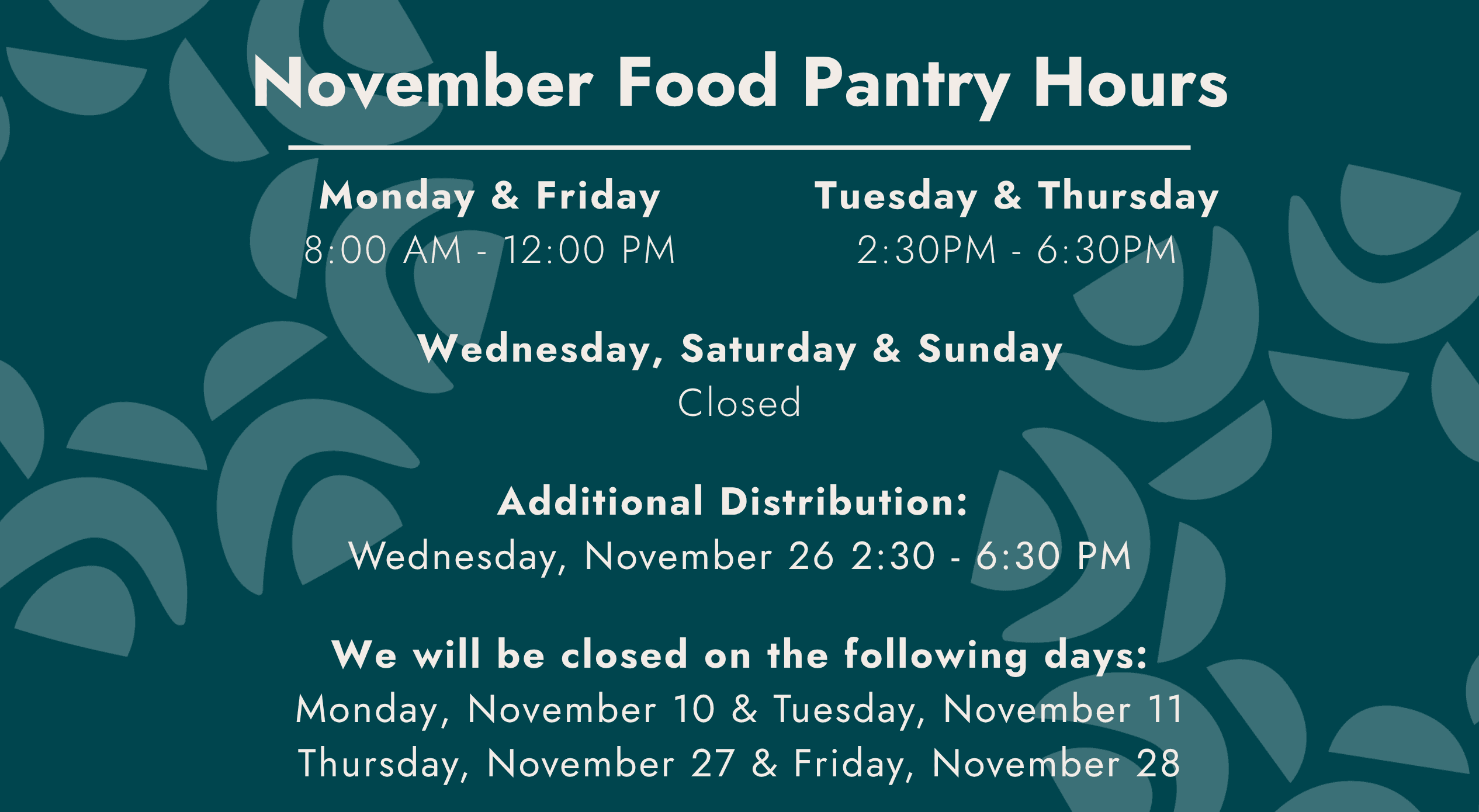There will be an additional food distribution on Wednesday, November 26, 2:30 PM - 6:30 PM