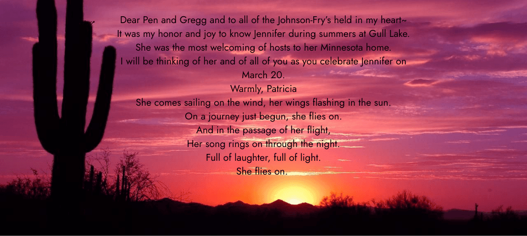 The Johnson family will join with the community in celebrating Jennifer’s life on March 20th from 2-4pm at the Tempe Center for the Arts.